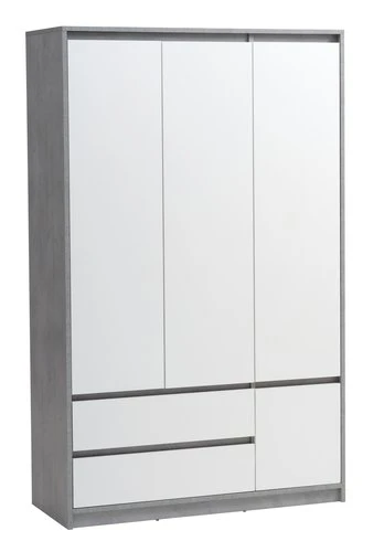 En panneau de particules mélaminé, placage décoratif. Intérieur de garde-robe : 4 étagères et 1 tringle à vêtements. 4 portes, 2 tiroirs. l119 x H193 x P51 cm