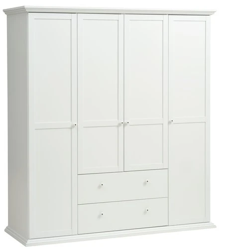 En panneau de particules, placage feuille. Pieds : plastique. IntĂ©rieur de garde-robe : 8 Ă©tagĂšres et 1 tringle Ă vĂȘtements. 4 portes, 2 tiroirs. l183 x H200 x P64 cm