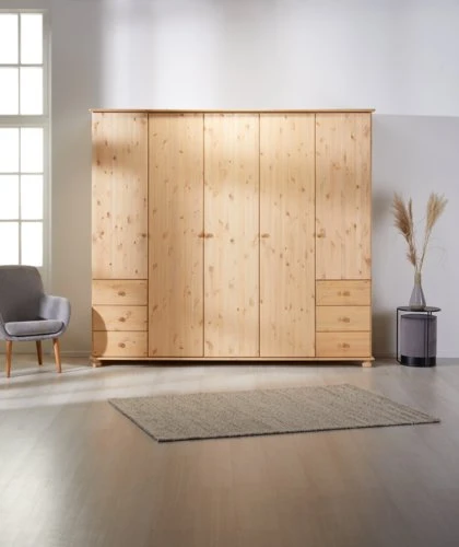 En pin massif. Huilé. Intérieur : 1 tringle à vêtements, 6 étagères. 5 portes, 6 tiroirs. l248 x H224 x P60 cm