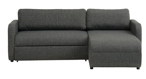 En panneau de particules, HDF6, pin massif, feutre. Garnissage : mousse polyuréthane (30 kg/m³). Assise : ressorts bonell. Revêtement : polyester. Pieds : plastique. Avec espace de rangement. Réversible. Couchage : 131×200 cm. 3 places. l222 x H85 x P88/142 cm