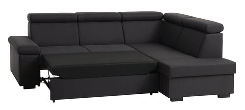 Structure : panneau de particules, pin massif. Garnissage : mousse polyester. Revêtement : polyester. Pieds : plastique. Non réversible. Avec espace de rangement sous la méridienne. Couchage : 126×182 cm. 3 places. l246 x H87 x P187 cm
