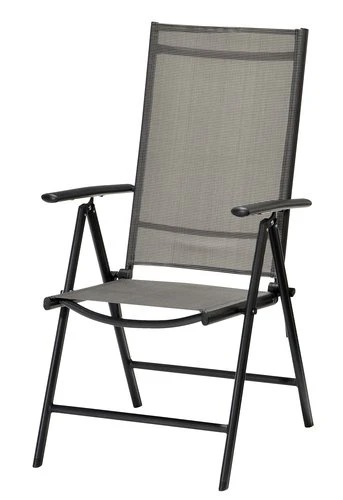 En aluminium et textilène (polyester/PVC). 7 positions. Pliable. l55 x H106 x P68 cm