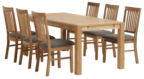 Table : panneau de particules plaqué chêne, chêne massif. Finition huilée. Excl. rallonges. l90 x L190 x H76 cm. Chaise : structure : panneau de particules, dossier et pieds : chêne massif. Garnissage : mousse polyuréthane (30 kg/m). Revêtement : polyester. l45 x H96 x P60 cm
