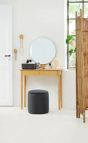 En MDF, revêtement : polyester, garnissage : mousse polyuréthane. Avec espace de rangement. Ø36 x H40 cm
