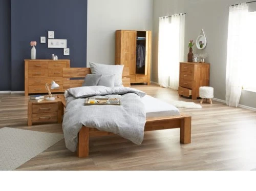 Chêne massif et placage chêne. Portes soft-close. Tiroirs soft-close. Intérieur la garde-robe : 6 étagères et 1 tringle à vêtements. l120 x H200 x P60 cm