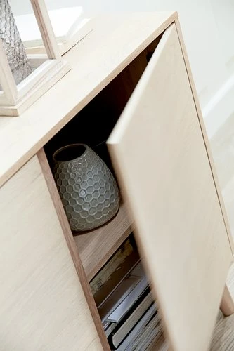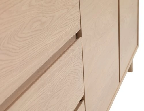 Face avant, partie supérieure et inférieure, côtés, 1 étagère : placage chêne, panneau de particules. Pieds : chêne massif. 2 portes soft-close, 3 tiroirs soft-close avec glissières d’extension complète. l160 x H80 x P45 cm