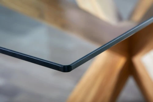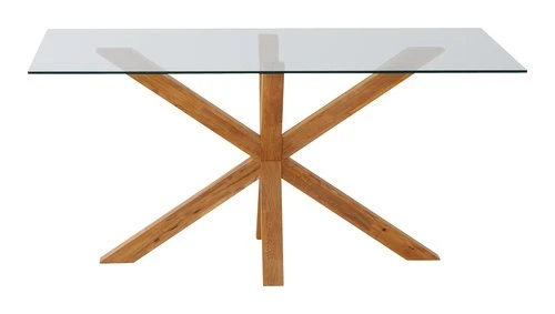 Plateau : verre trempé. Piètement : chêne massif, acier. Finition huilée. l90 x L160 x H75 cm