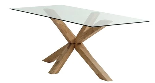 Plateau : verre trempé. Pieds : chêne massif, acier. Huilé. l90 x L190 x H75 cm