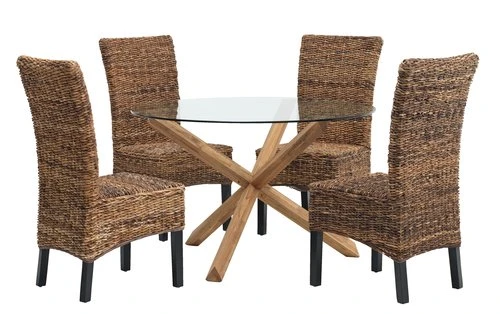 Plateau : verre trempé. Pieds : chêne et bouleau massifs. Finition huilée. Ø119 x H75 cm