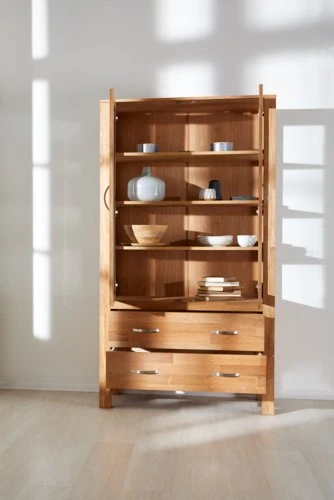 Chêne massif, placage chêne et verre trempé. l100 x H190 x P45 cm