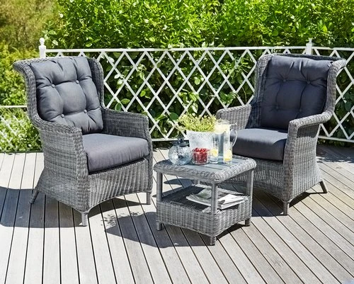 Cadre : aluminium, polyrotin (polyéthylène). Plateau : DURAWOOD® bois composite (polypropylène/fibre de bois). Le DURAWOOD® est un matériau composite durable constitué à partir de fibres de bois dur FSC® et de plastique. l50 x L50 x H45 cm