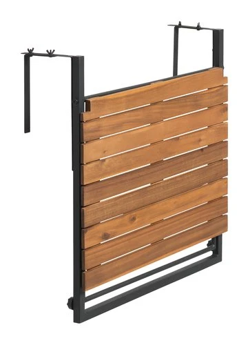 Cadre : acier galvanisé. Plateau : bois d’acacia FSC®. Avec vis pour ajuster la hauteur et la distance de la balustrade du balcon. Pliable. Finition huilée. Résiste au gel. l43 x L57 x H61 cm