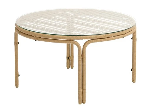 Cadre : polyrotin (polyéthylène), acier. Plateau : verre trempé. Finition vernie. Ø80 x H44 cm