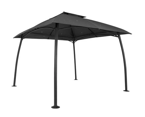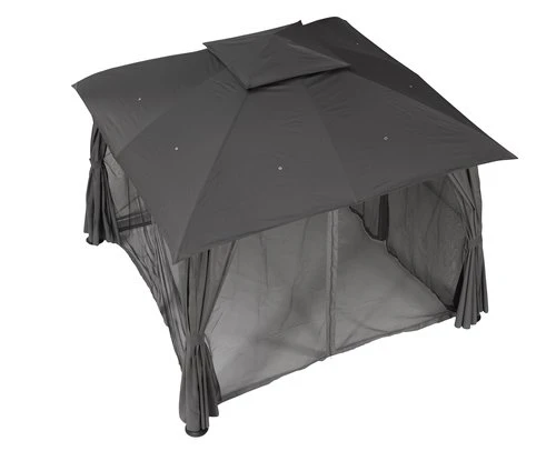 Cadre en acier et auvent en polyester étanche. Charge hydrostatique 600mm. Poids : 50kg. Incl. panneaux latéraux amovibles et moustiquaire. l3 x L3 x H2,65 m