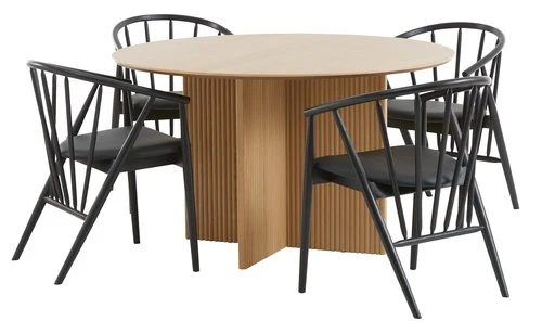 Table : MDF, placage chêne. Pieds : MDF, placage chêne, panneau de particules, chêne massif. Vernis transparent. Ø130 x H75 cm. Chaise : assise : contreplaqué. Dossier, accoudoirs, pieds : chêne massif. Garnissage : mousse polyéther (35 kg/m³). Revêtement : polyuréthane. l56 x H79 x P58 cm