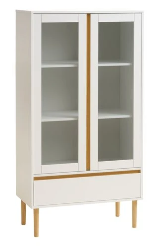En MDF mélaminé, panneau de particules, plastique ABS. Pieds : bois de caoutchouc massif. 1 tiroir, 2 portes, 2 étagères. l80 x H150 x P40 cm